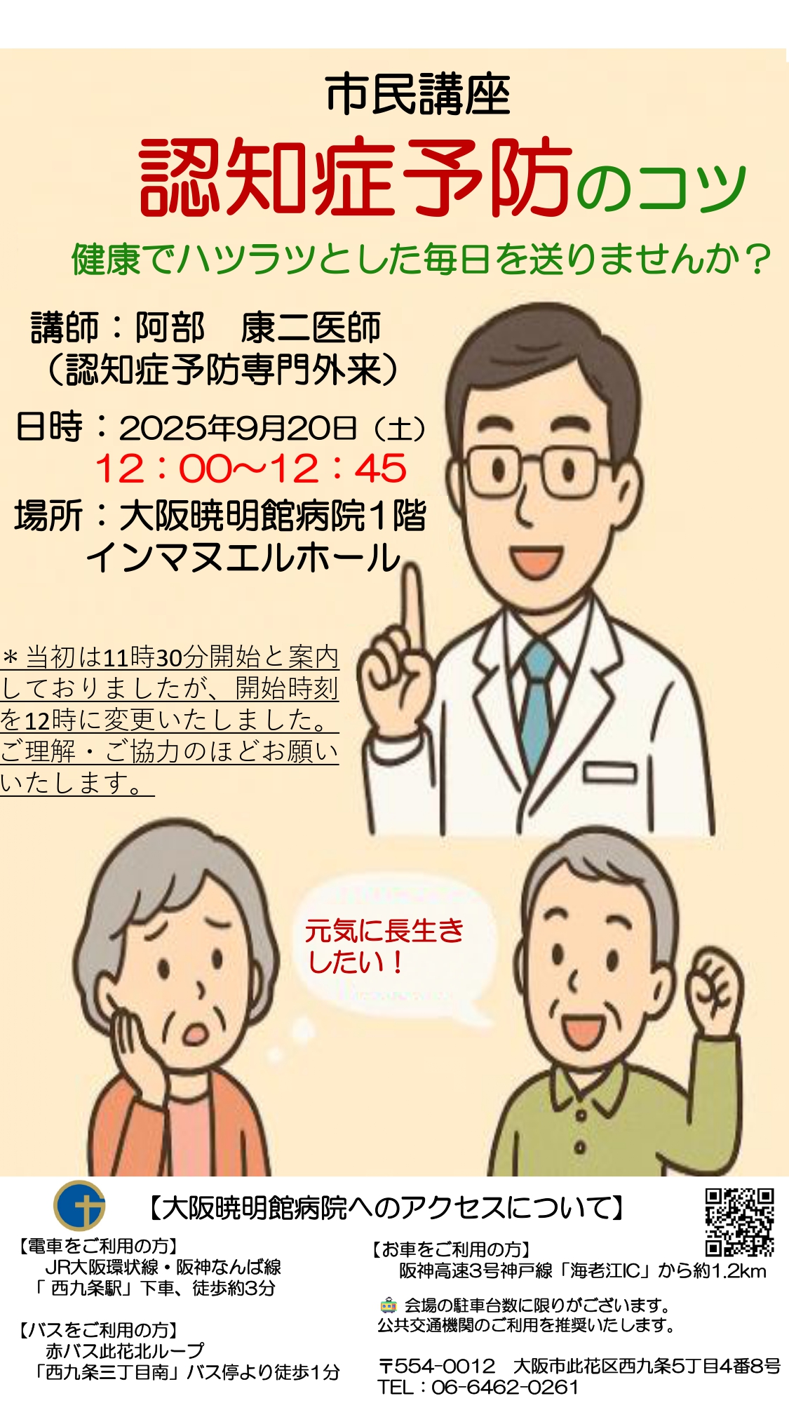 9月20日(土)開催「認知症予防外来」阿部 康二先生 市民公開講座 開催時間変更のお知らせ