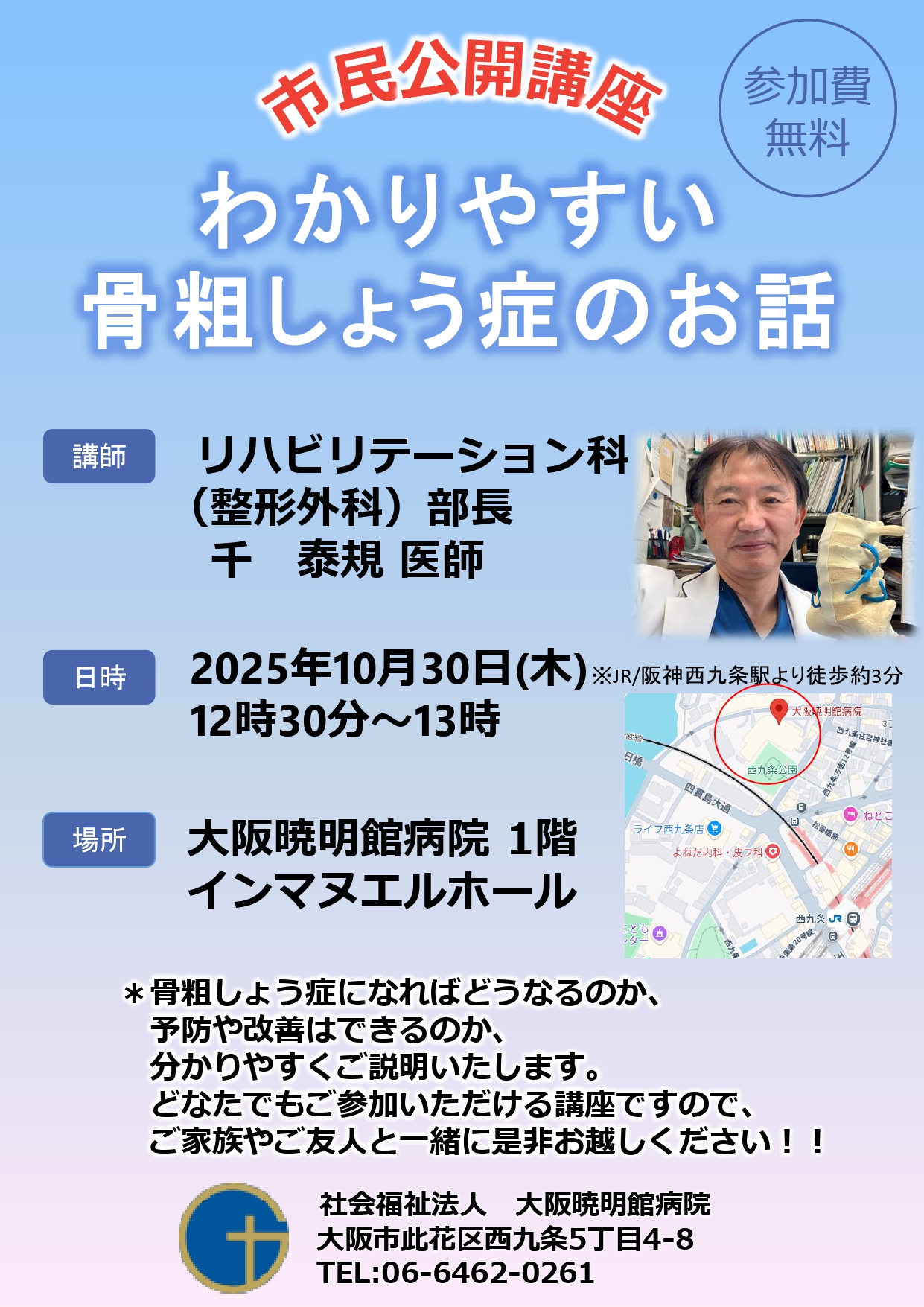 2025年10月30日(木)12時30分より、大阪暁明館病院1階インマヌエルホールにて市民公開講座を開催いたします。